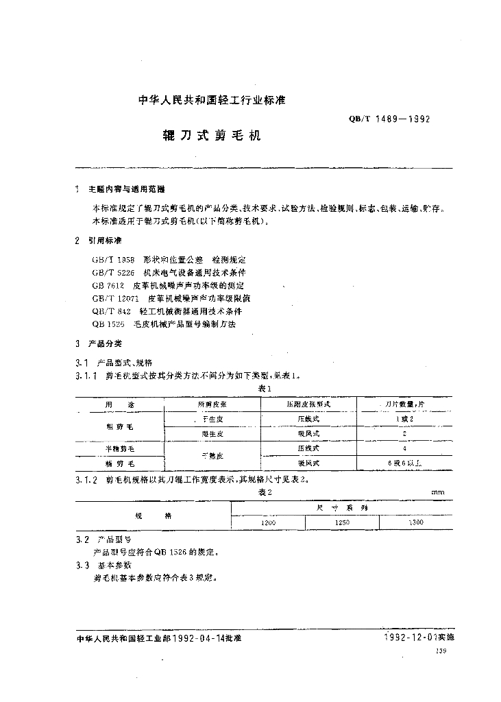 QB/T 1489-1992 辑刀式剪毛机