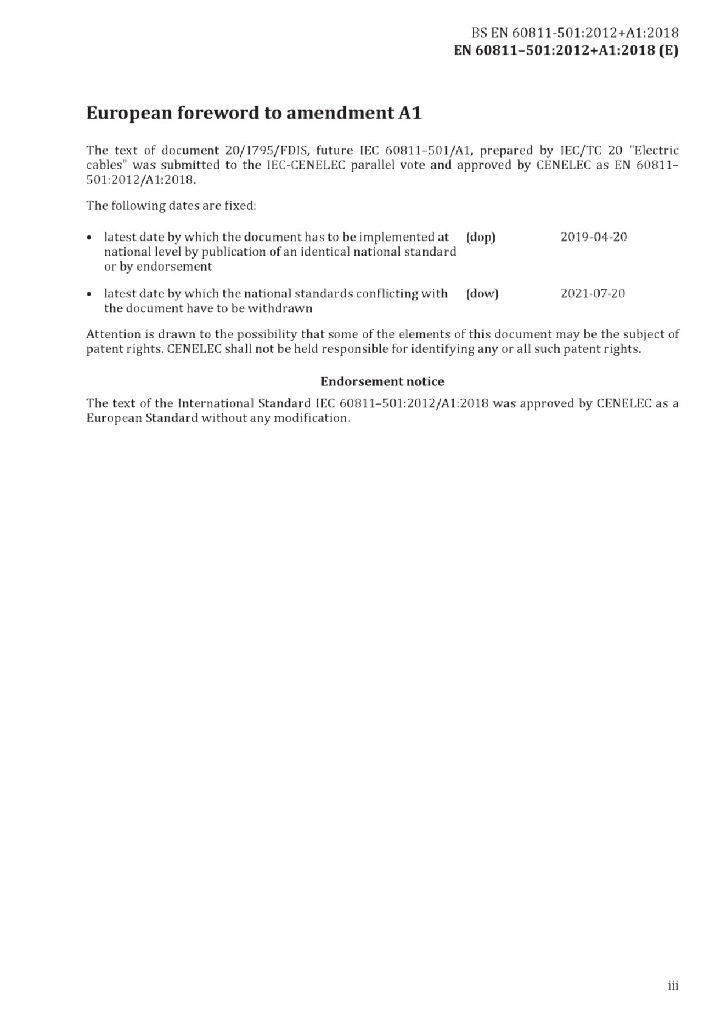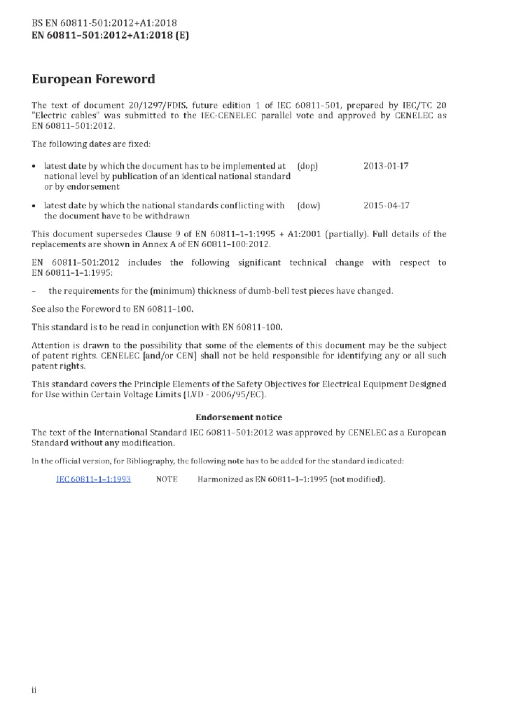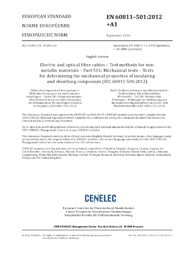 BS EN 60811-501:2012+A1:2018 电缆和光缆 非金属材料的试验方法 第501部分:机械性能试验 测定绝缘和护套机械性能测试方法