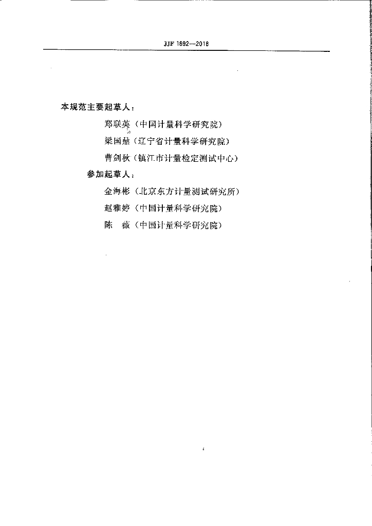 郑联英(中国计量科学研究院)、梁国鼎(辽宁省计量科学研究院)、曹剑秋(镇江市计量检定测试中心)、金海彬(北京东方计量测试研究所)、赵雅婷(中国计量科学研究院)、陈薇(中国计量科学研究院)