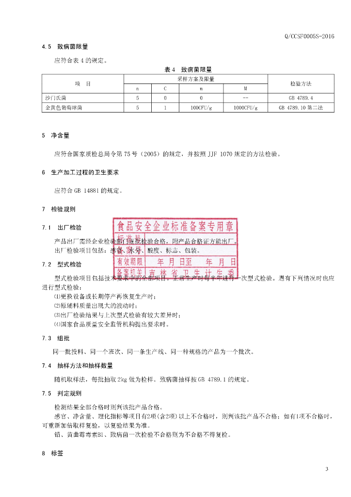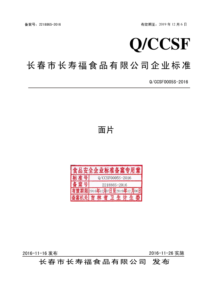 Q/CCSF 0005S-2016 长春市长寿福食品有限公司 面片