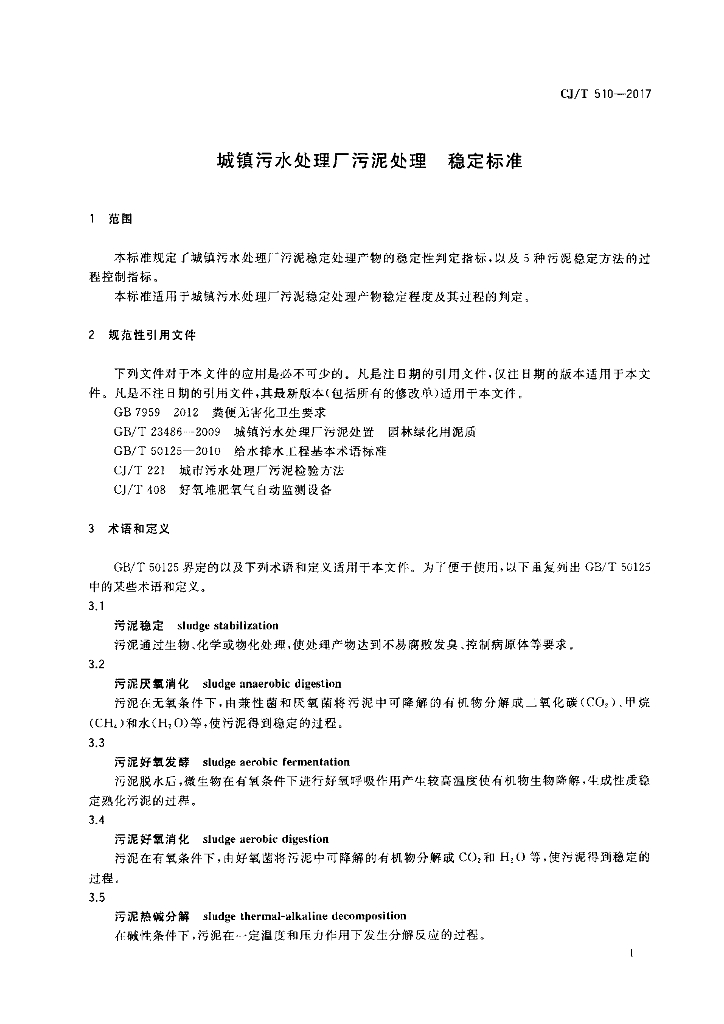 CJ/T 510-2017 城镇污水处理厂污泥处理 稳定标准