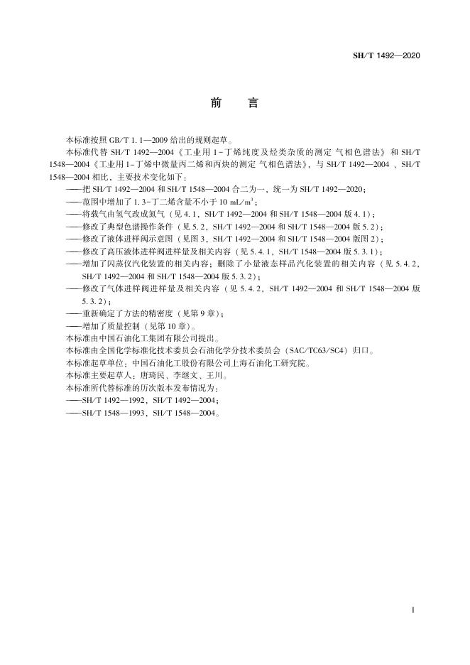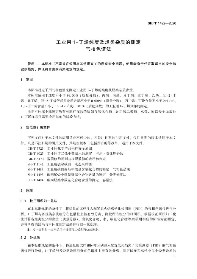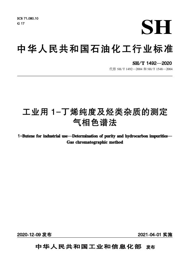SH/T 1492-2020 工业用1-丁烯纯度及烃类杂质的测定 气相色谱法