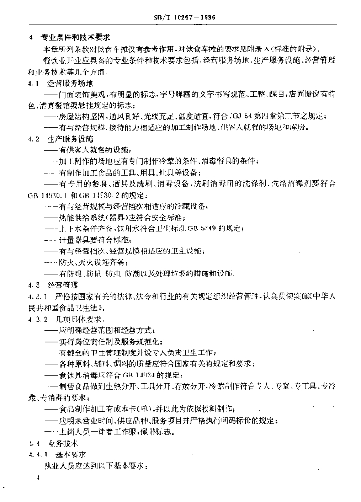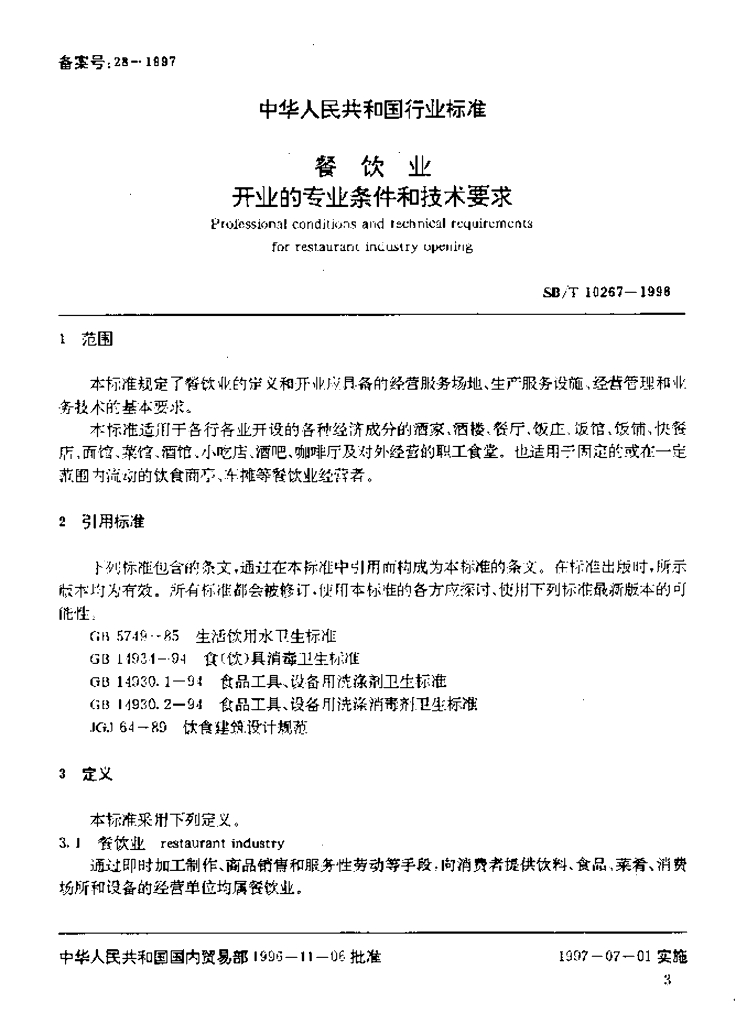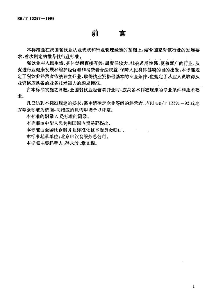 SB/T 10267-1996 餐饮业开业的专业条件和技术要求