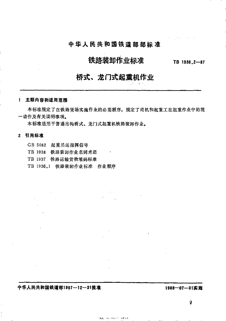 TB/T 1936.2-1987 铁路装卸作业标准 桥式、龙门式起重机作业