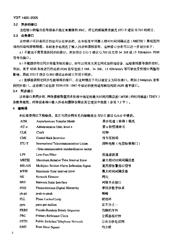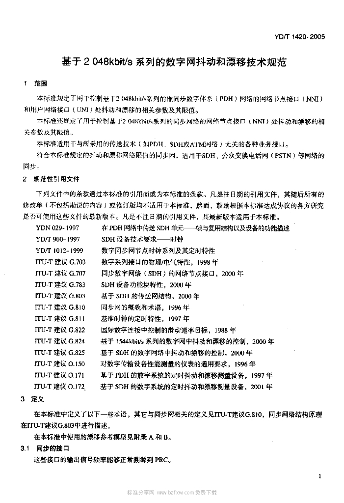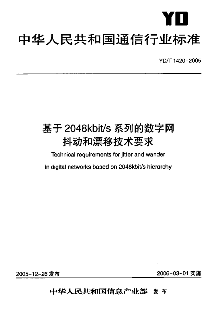 YD/T 1420-2005 基于 2048kbit/s 系列的数字网抖动和漂移技术要求
