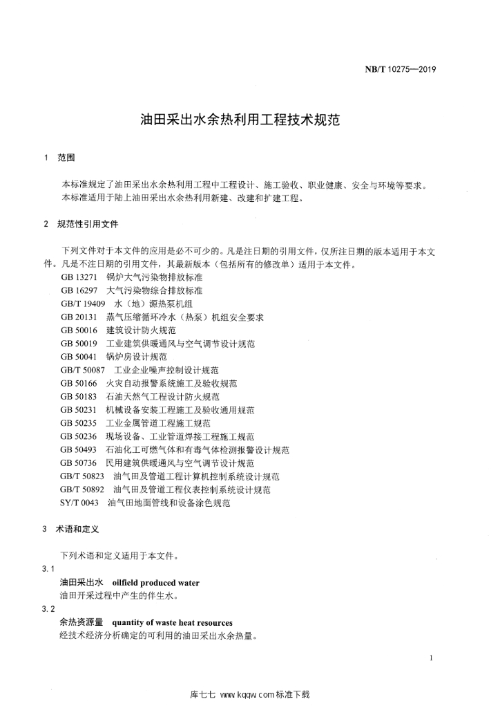 NB/T 10275-2019 油田采出水余热利用工程技术规范