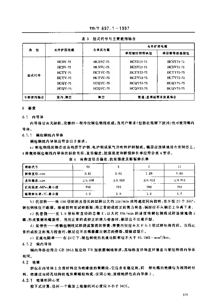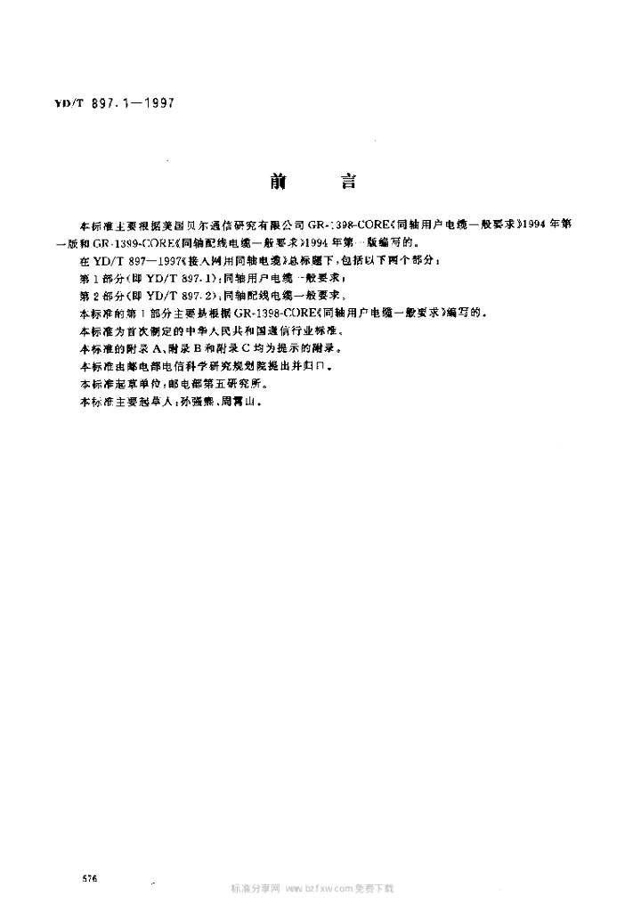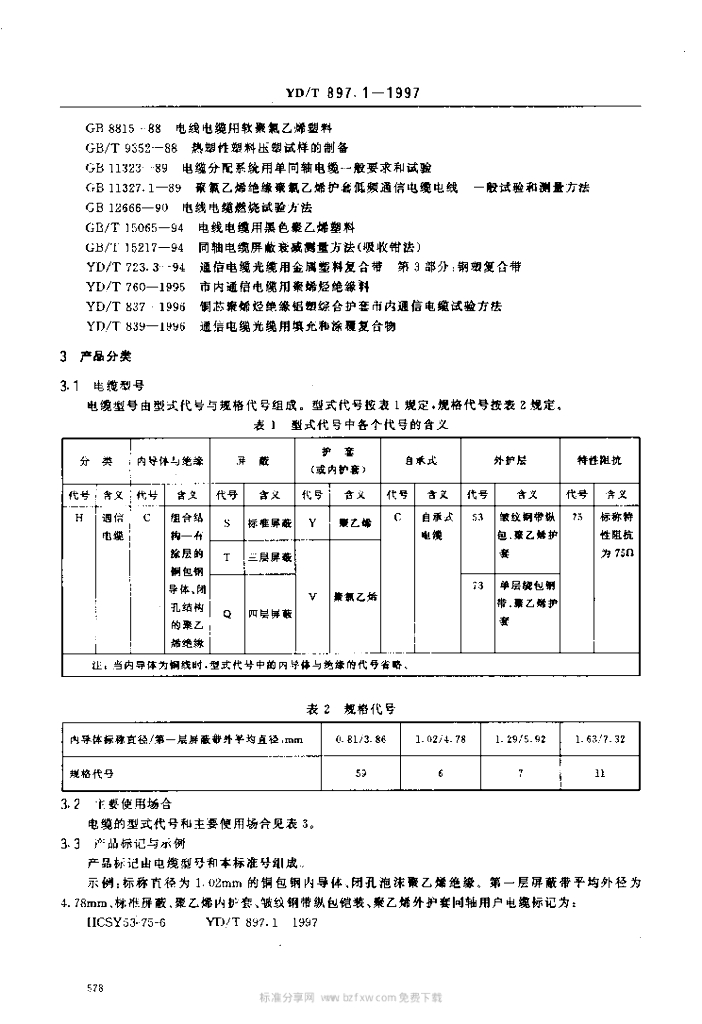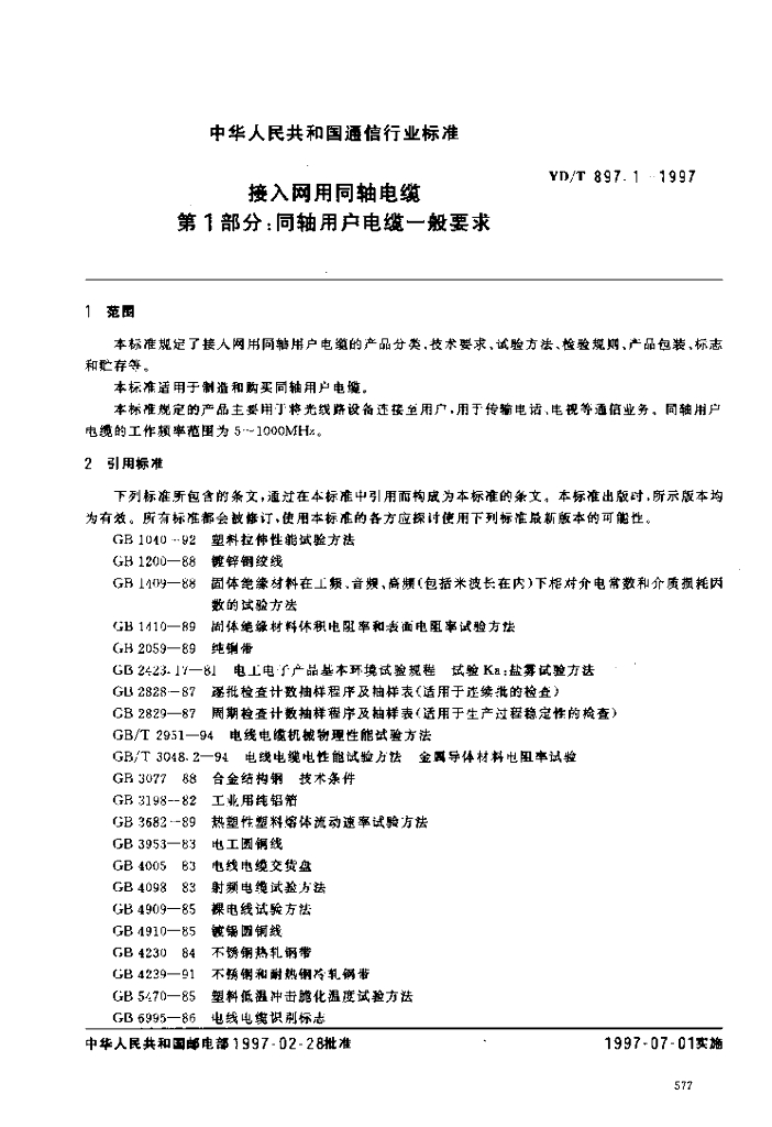 YD/T 897.1-1997 接入网用同轴电缆 第1部分:同轴用户电缆一般要求
