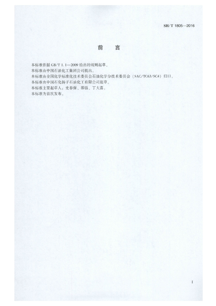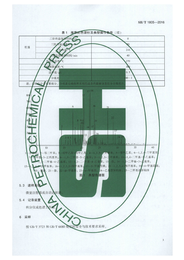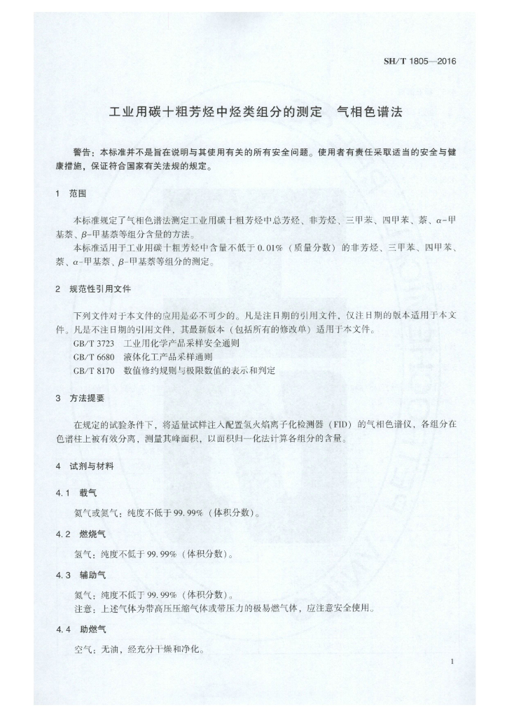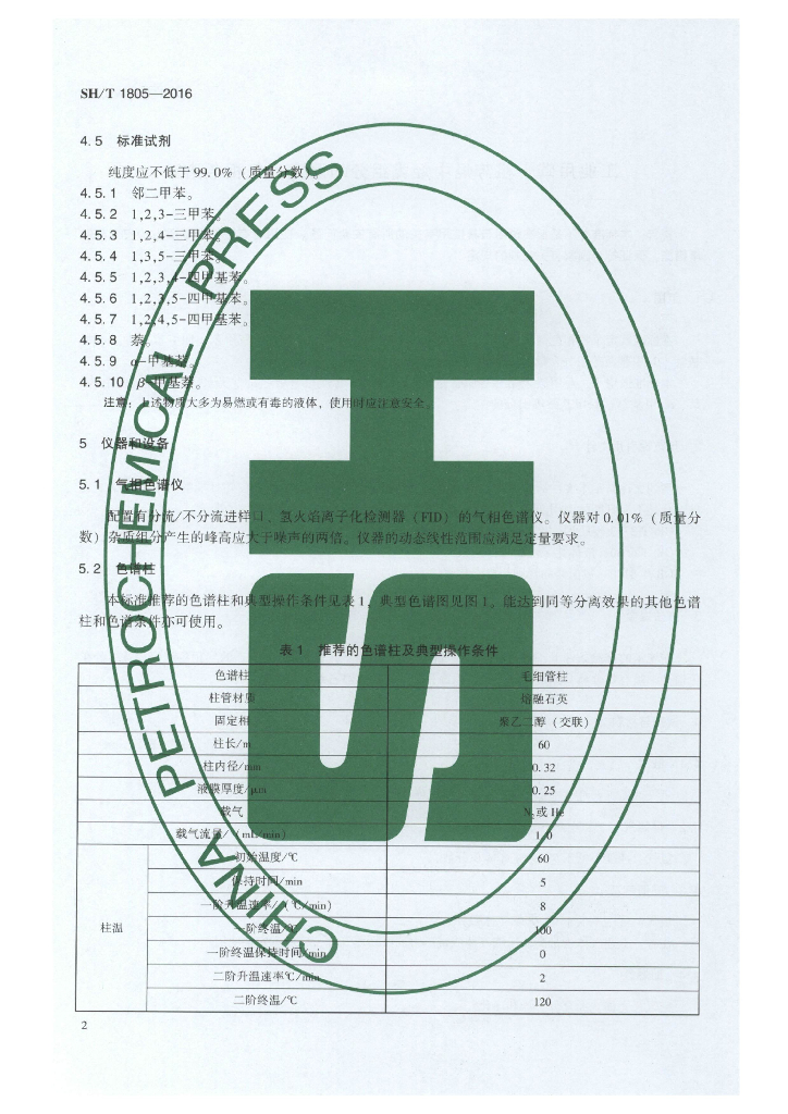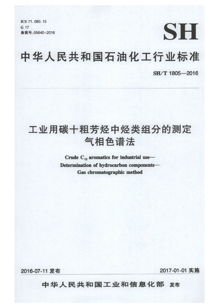 SH/T 1805-2016 工业用碳十粗芳烃中烃类组分的测定 气相色谱法