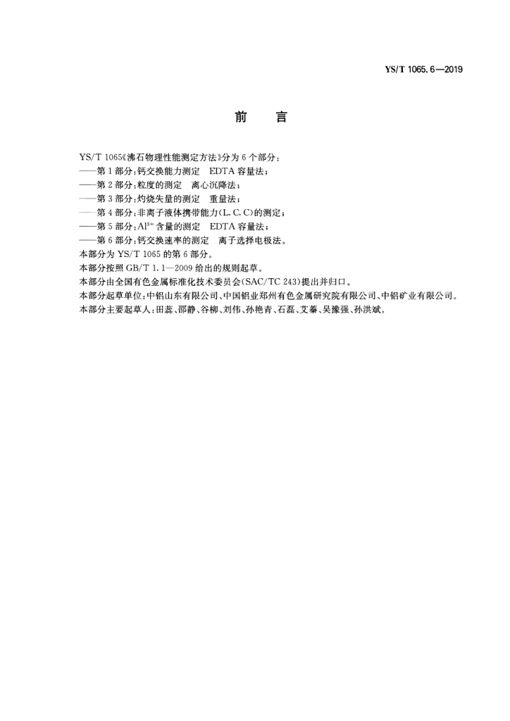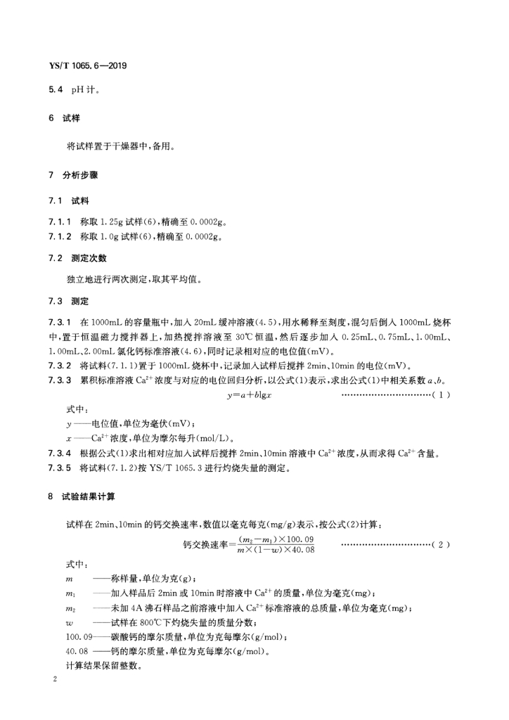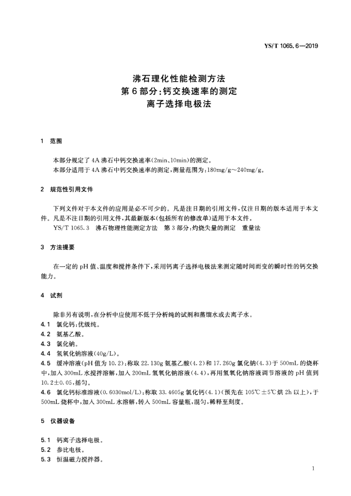 YS/T 1065.6-2019 沸石理化性能检测方法 第6部分:钙交换速率的测定 离子选择电极法