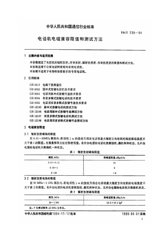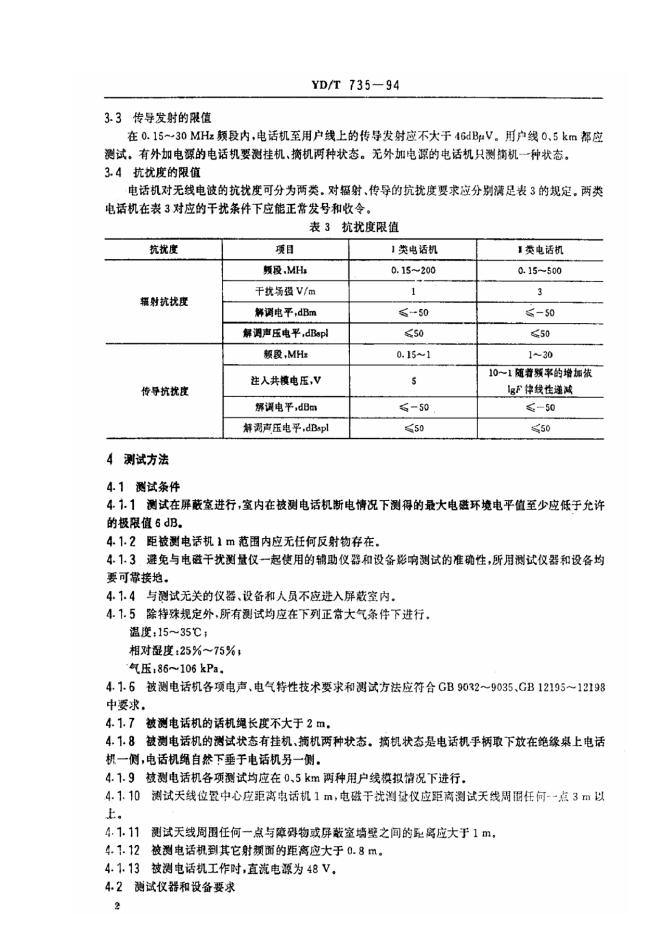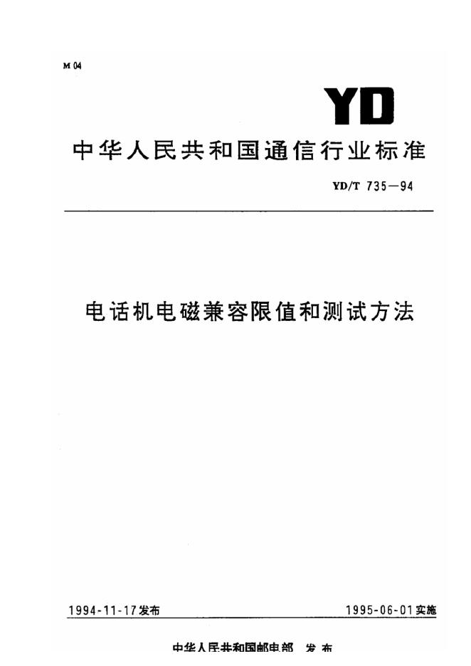 YD/T 735-1994 电话机电磁兼容限值和测试方法