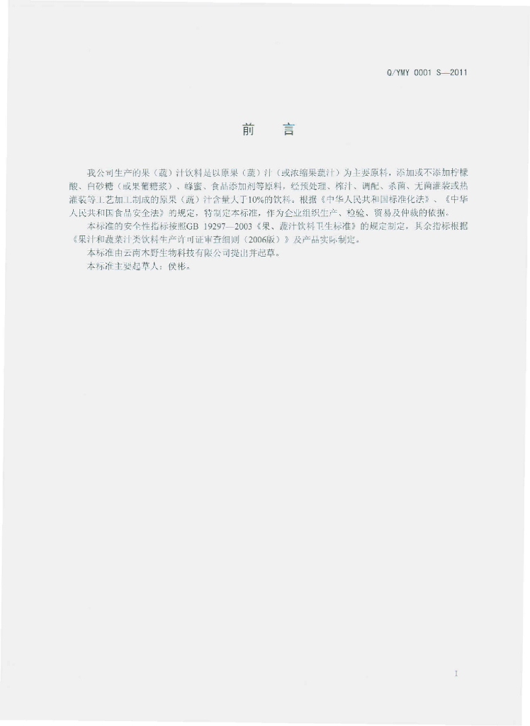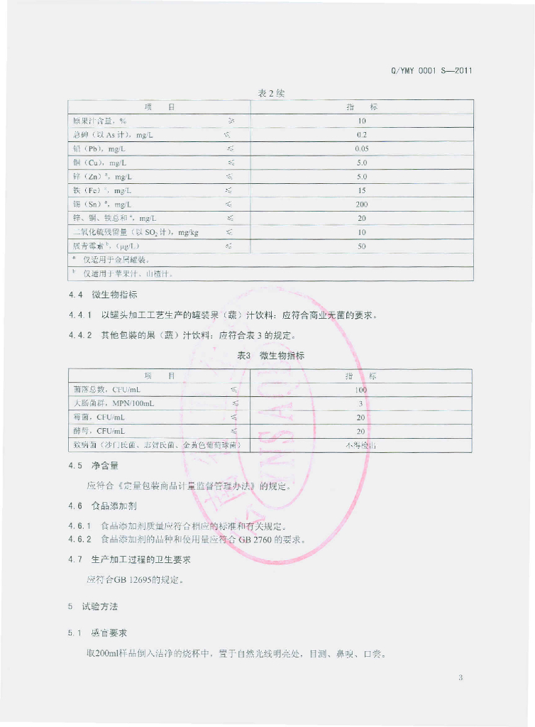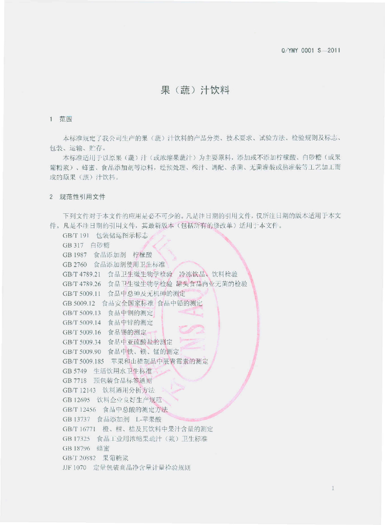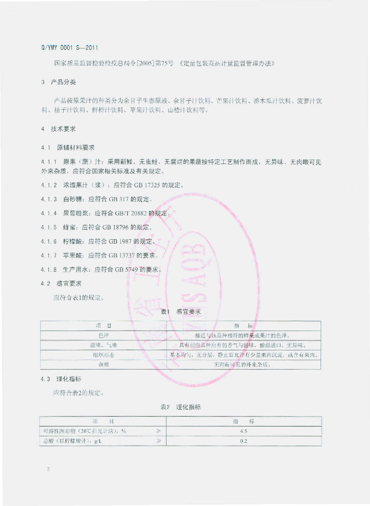 Q/YMY 0001S-2011 果(蔬)汁饮料