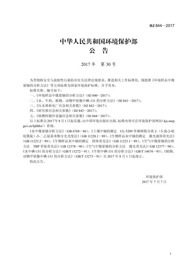 HJ 844-2017 核燃料循环设施应急相关参数