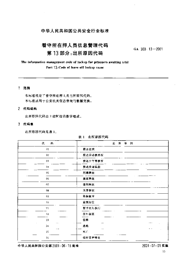 GA 300.13-2001 看守所在押人员信息管理代码 第13部分 出所原因代码