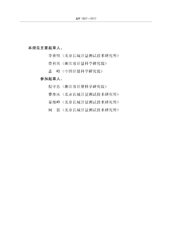 李善明(北京长城计量测试技术研究所)、曾利民(浙江省计量科学研究院)、孟峰(中国计量科学研究院)、倪守忠(浙江省计量科学研究院)、曹亦庆(北京长城计量测试技术研究所)、秦海峰(北京长城计量测试技术研究所)、何旋(北京长城计量测试技术研究所)