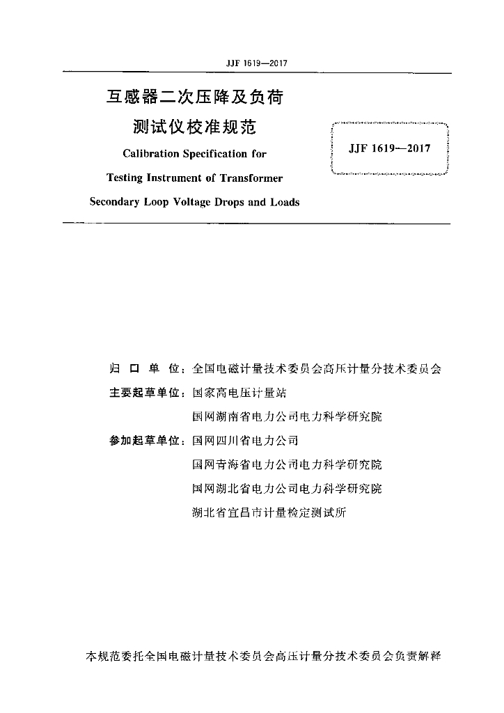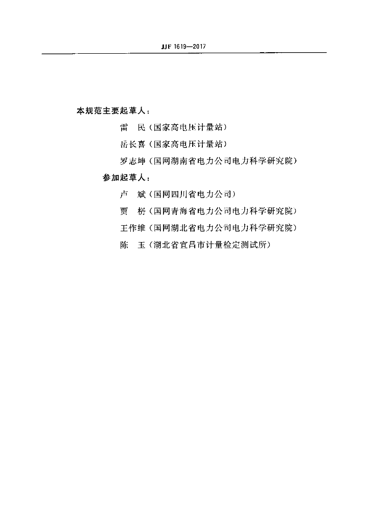雷民(国家高电压计量站)、岳长喜(国家高电压计量站)、罗志坤(国网湖南省电力公司电力科学研究院)、卢斌(国网四川省电力公司)、贾丹(国网青海省电力公司电力科学研究院)、王作维(国网湖北省电力公司电力科学研究院)、陈玉(湖北省宜昌市计量检定测试所)