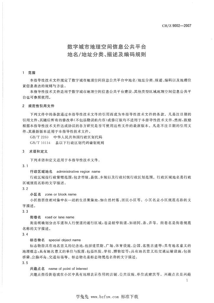 CH/Z 9002-2007 数字城市地理空间信息公共平台地名地址分类、描述及编码规则