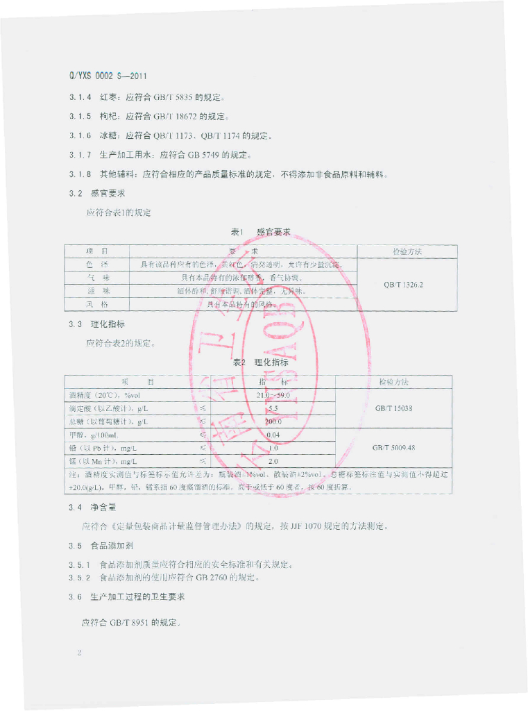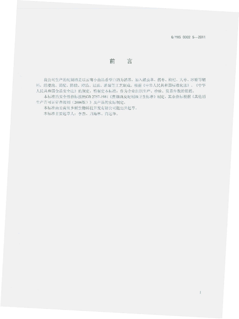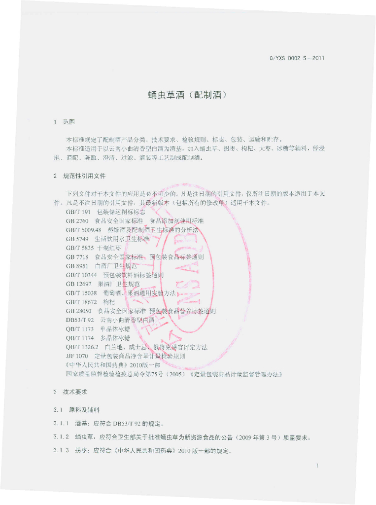 Q/YXS 0002S-2012 蛹虫草酒(配制酒)