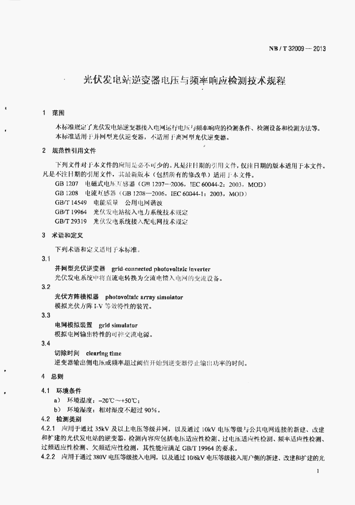 NB/T 32009-2013 光伏发电站逆变器电压与频率响应检测技术规程