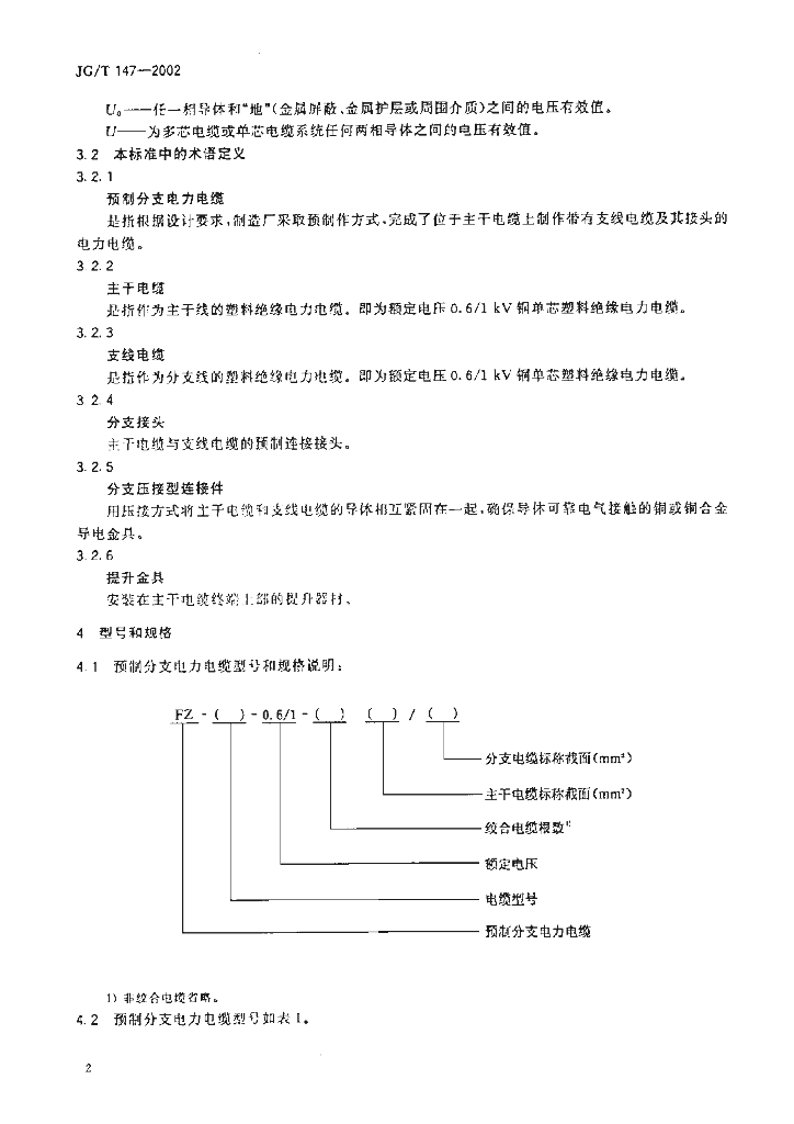 JG/T 147-2002 额定电压0.6/1kV铜芯塑料绝缘预制分支电力电缆