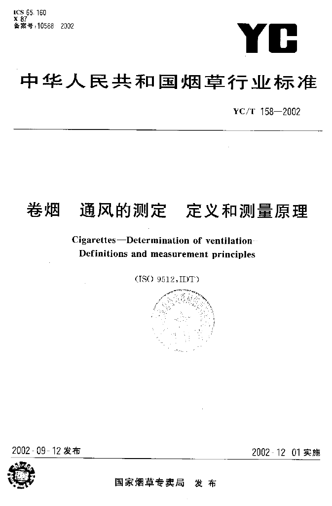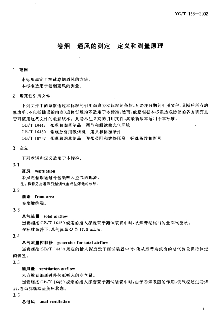 YC/T 158-2002 卷烟 通风的测定 定义和测量原理