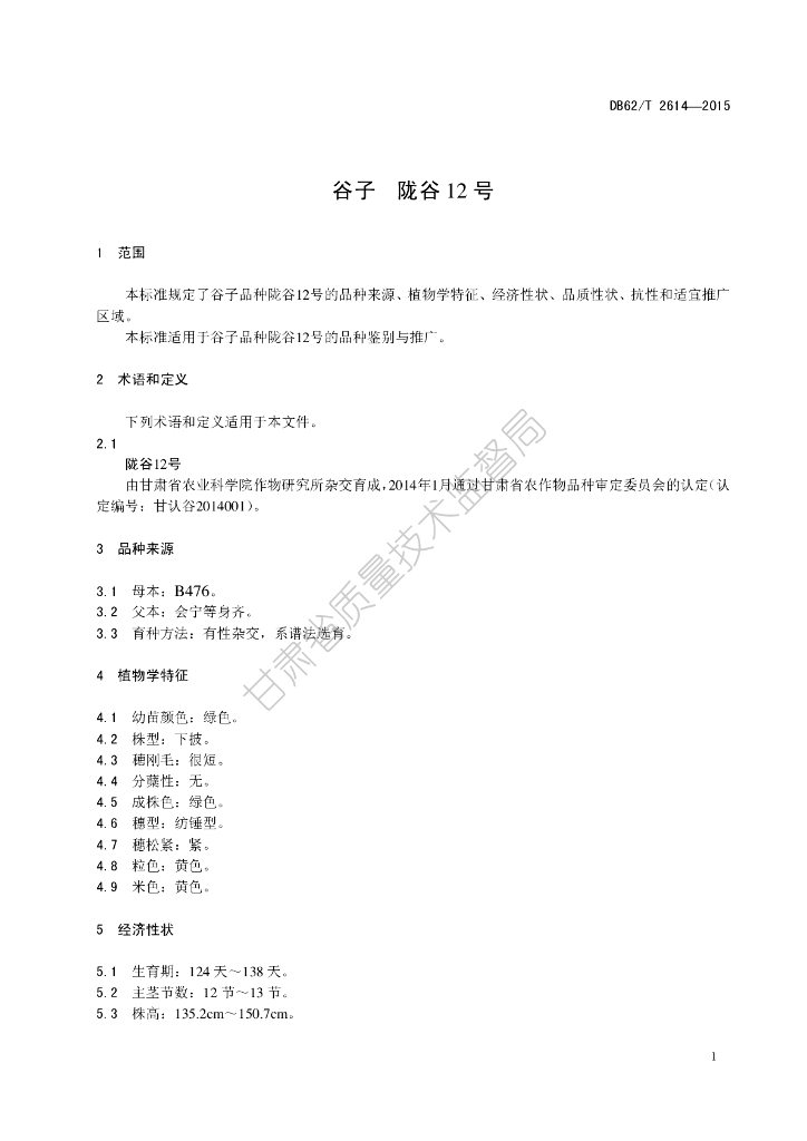 DB62/T 2614-2015 谷子 陇谷 12 号