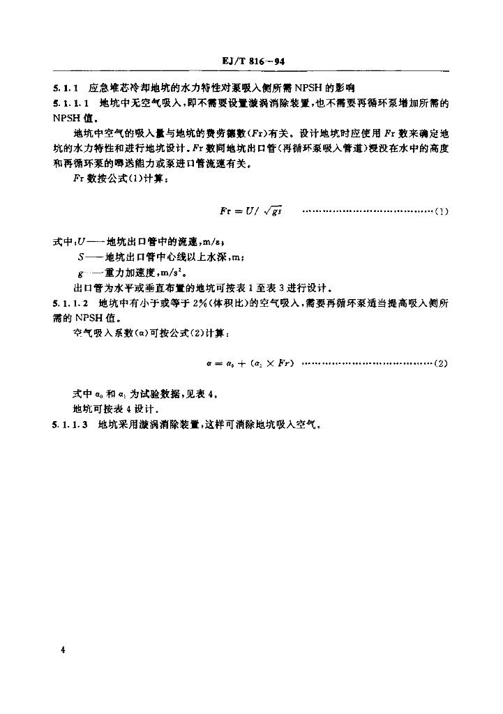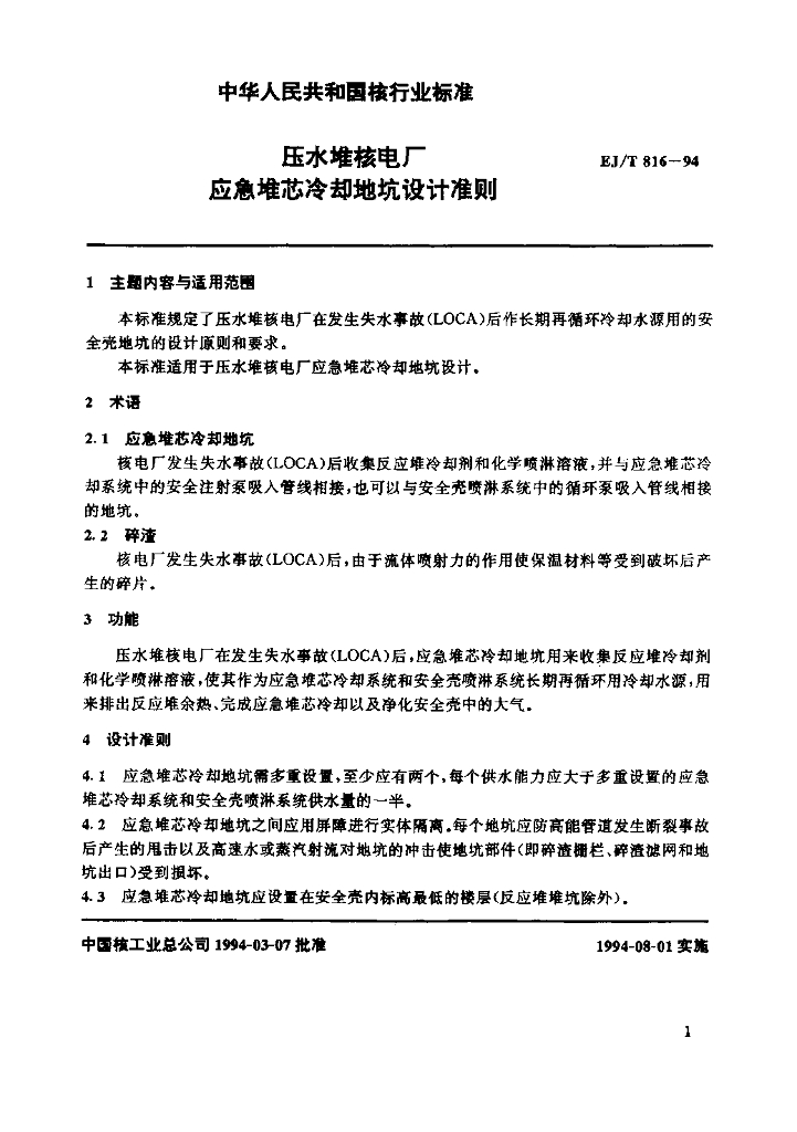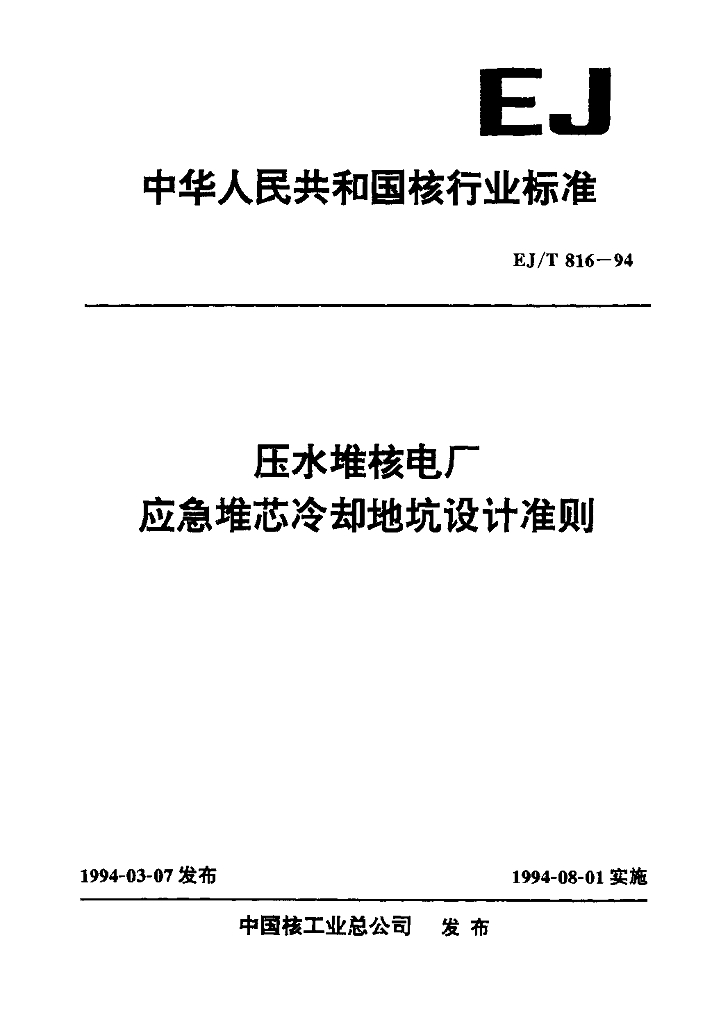 EJ/T 816-1994 压水堆核电厂应急堆芯冷却地坑设计准则