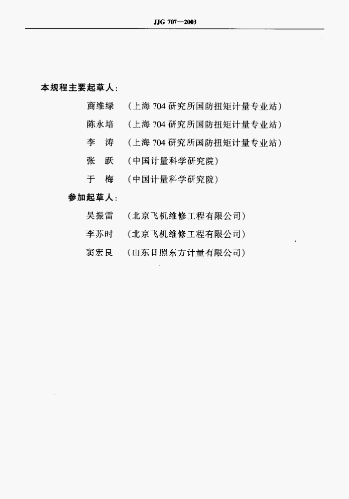 商维绿(上海704研究所国防扭矩计量专业站)、陈永培(上海704研究所国防扭矩计量专业站)、李涛(上海704研究所国防扭矩计量专业站)、张跃(中国计量科学研究院)、于梅(中国计量科学研究院)、吴振雷(北京飞机维修工程有限公司)、李苏时(北京飞机维修工程有限公司)、窦宏良(山东日照东方计量有限公司)