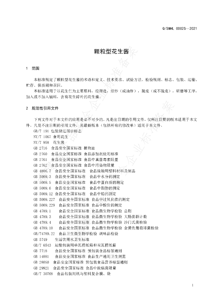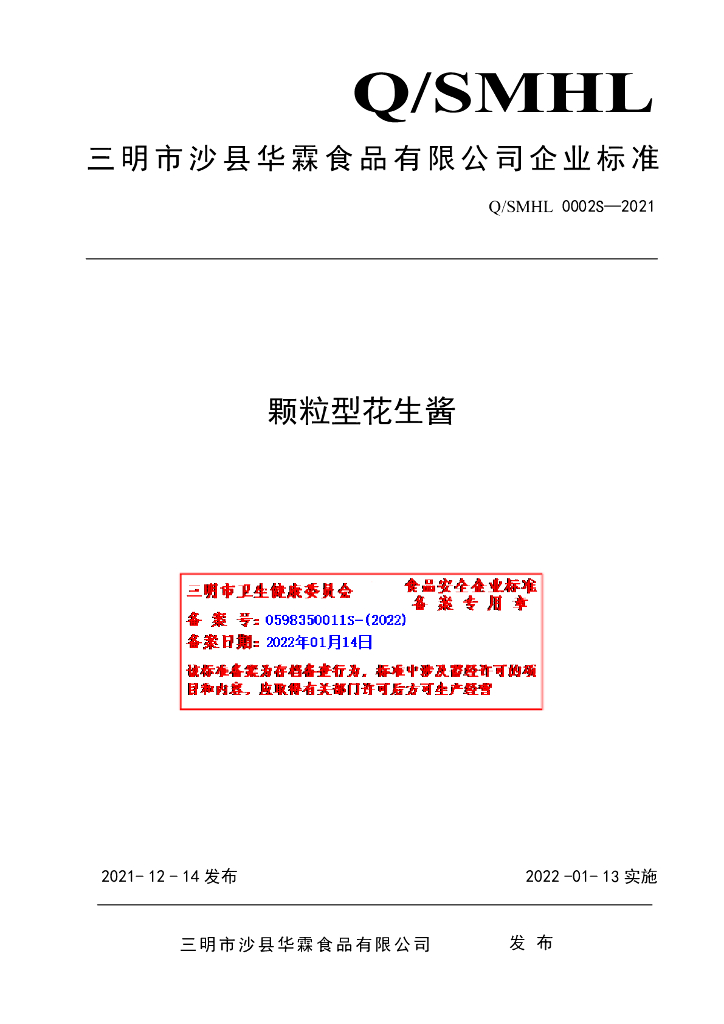 Q/SMHL 0002S-2021 颗粒型花生酱