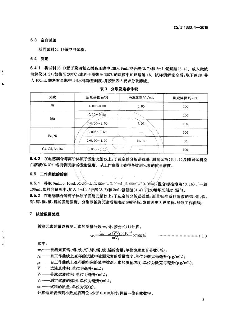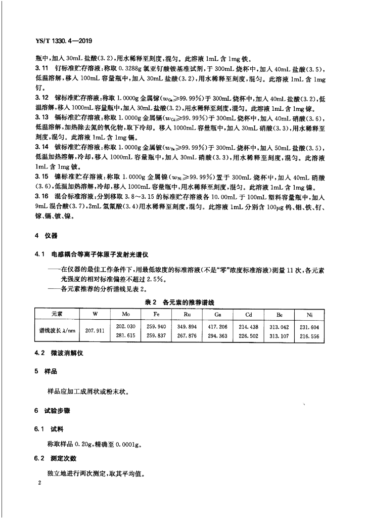 YS/T 1330.4-2019 钴铬烤瓷合金化学分析方法 第4部分:钨、钼、铁、钌、镓、镉、铍、镍含量的测定 电感耦合