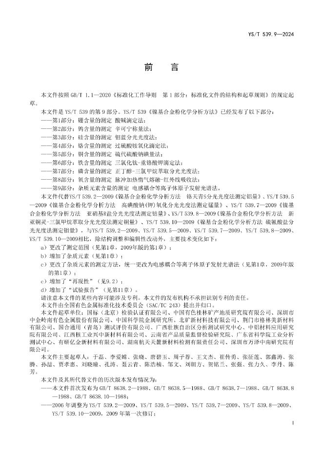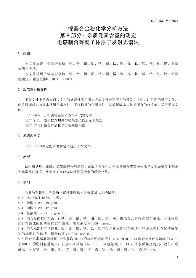 YS/T 539.9-2024 镍基合金粉化学分析方法 第9部分:杂质元素含量的测定 电感耦合等离子体原子发射光谱法