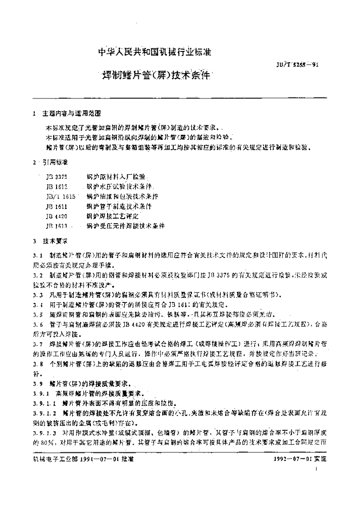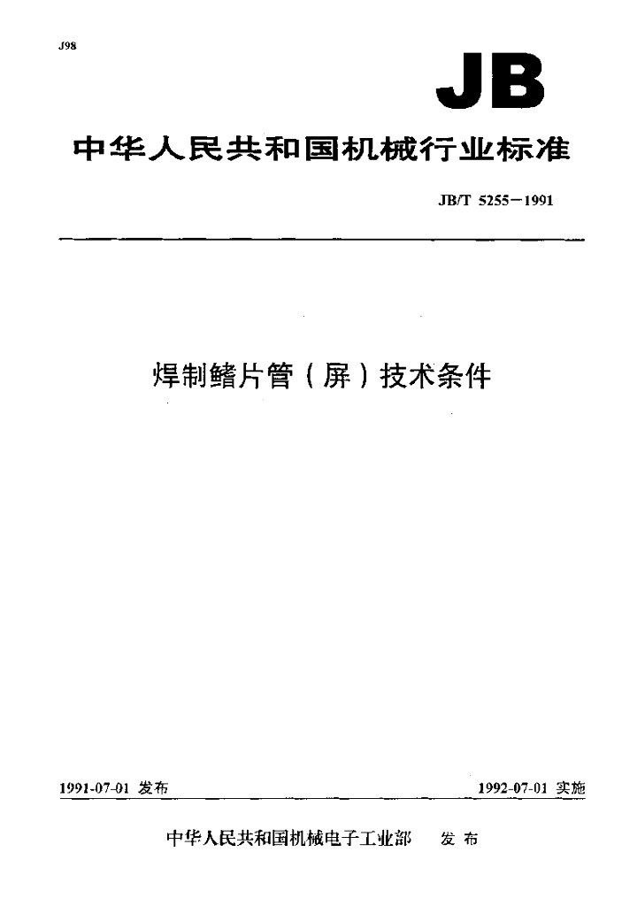 JB/T 5255-1991 焊制鳍片管(屏)技术条件