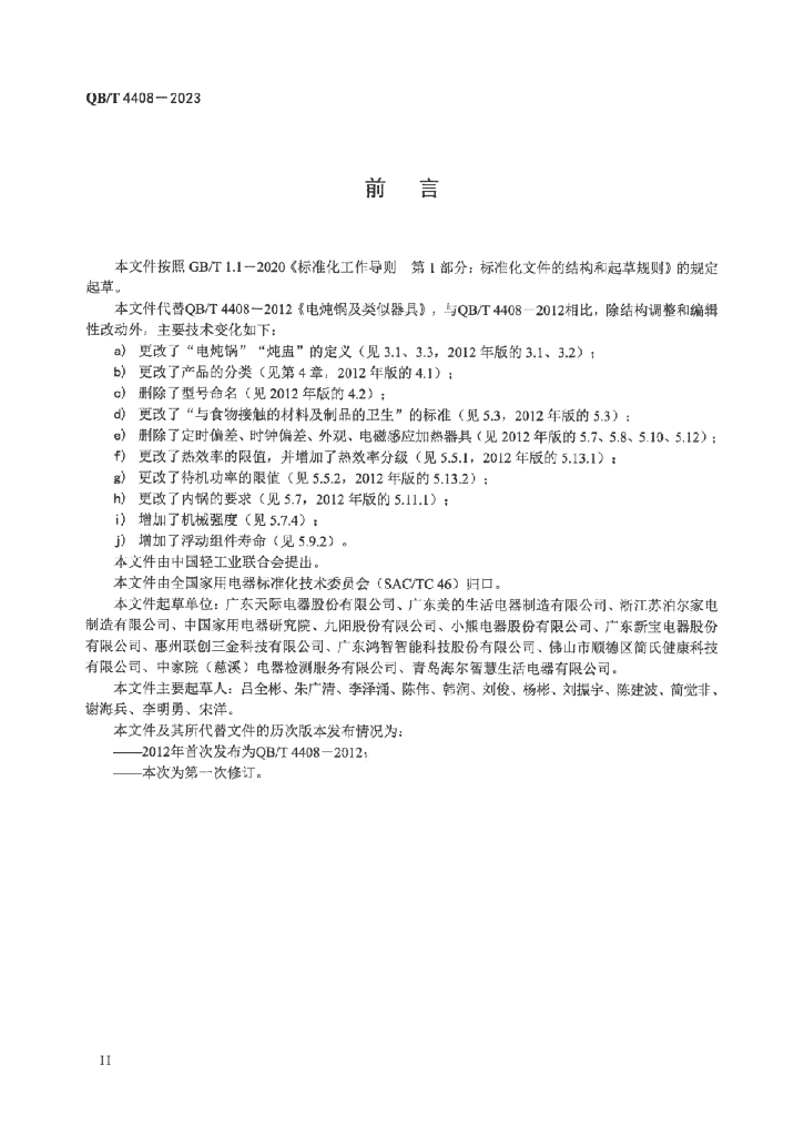 广东天际电器股份有限公司、广东美的生活电器制造有限公司、浙江苏泊尔家电制造有限公司、中国家用电器研究院、九阳股份有限公司、小熊电器股份有限公司、广东新宝电器股份有限公司、惠州联创三金科技有限公司、广东鸿智智能科技股份有限公司、佛山市顺德区简氏健康科技有限公司、中家院(慈溪)电器检测服务有限公司、青岛海尔智慧生活电器有限公司