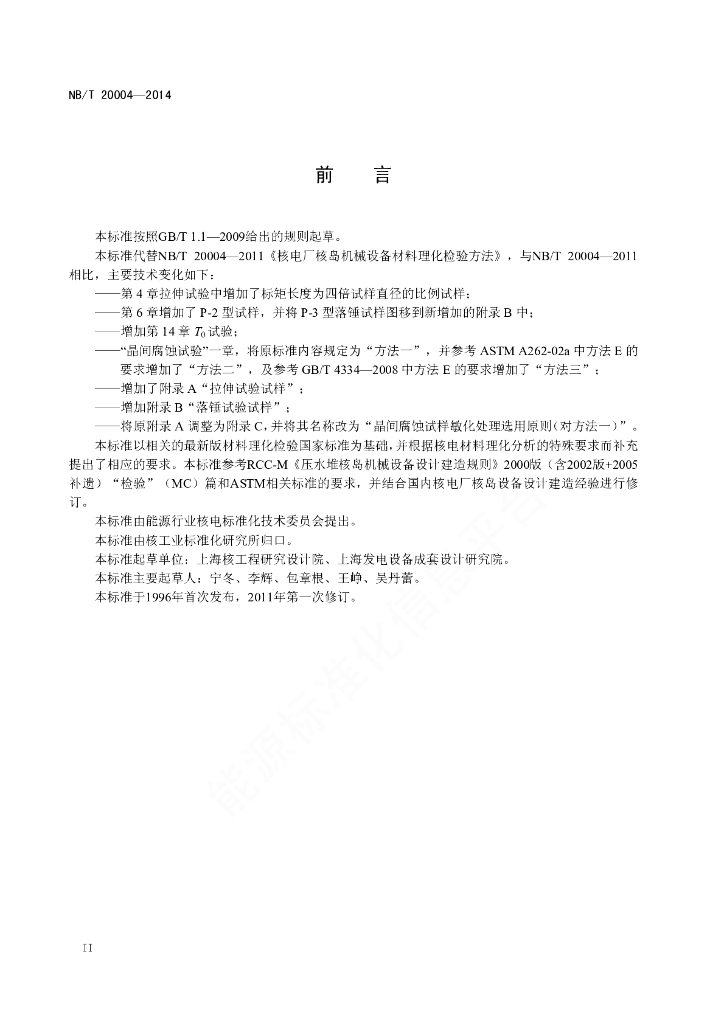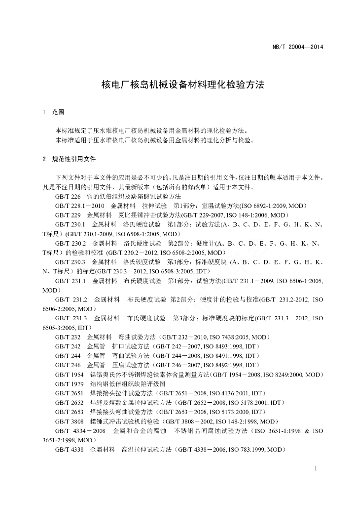 NB/T 20004-2014 核电厂核岛机械设备材料理化检验方法