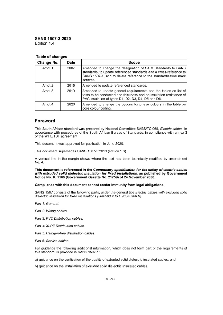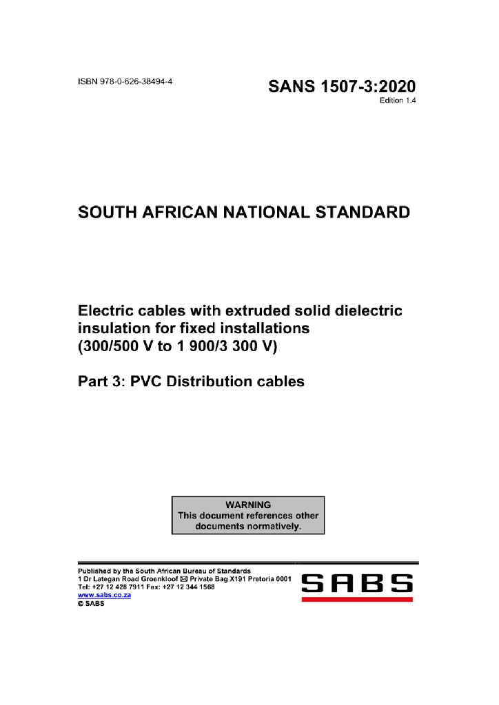 SANS 1507-3:2020 固定敷设用挤包固体电介质绝缘电缆(300 500V到1900 3300V) 第3部分 PVC绝缘配电电缆