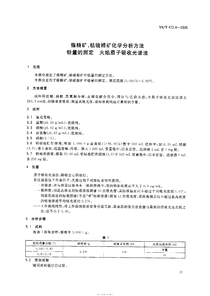 YS/T 472.4-2005 镍精矿、钴硫精矿化学分析方法 铅量的测定 火焰原子吸收光谱法