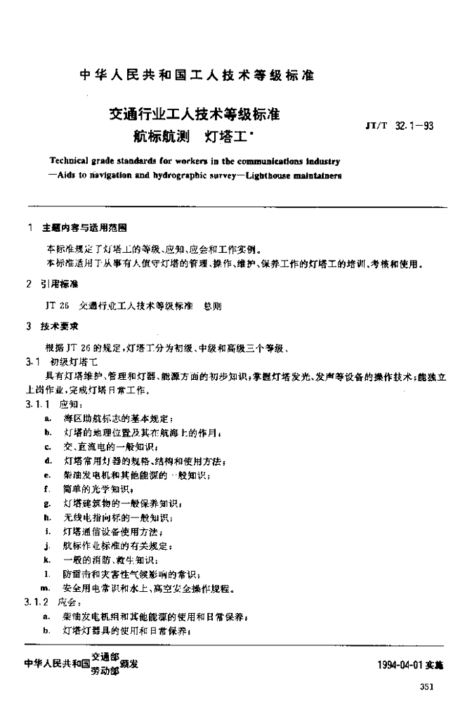 JT/T 32.1-1993 交通行业工人技术等级标准航标航测灯塔工