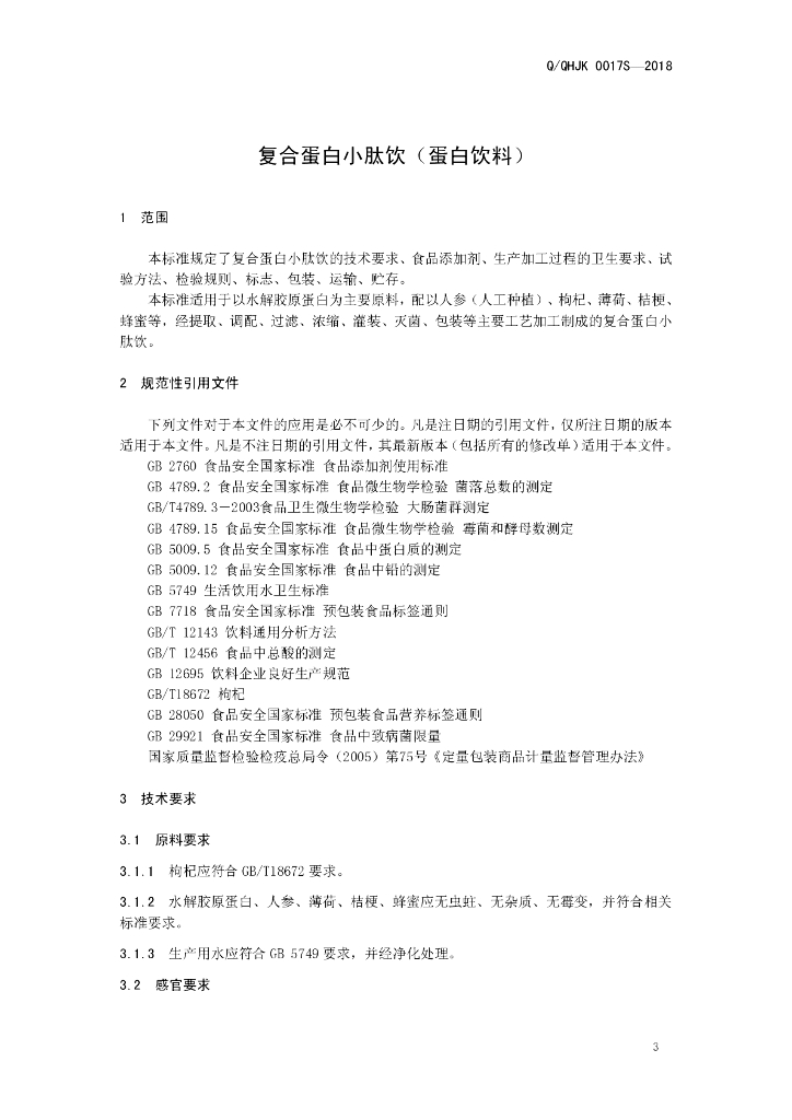 Q/QHJK 0017S-2018 复合蛋白小肽饮(蛋白饮料)