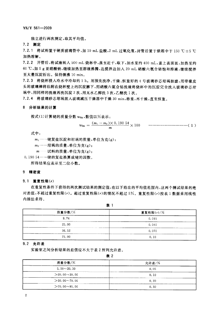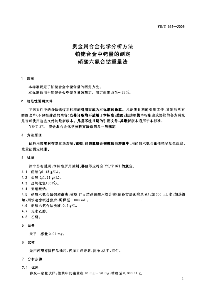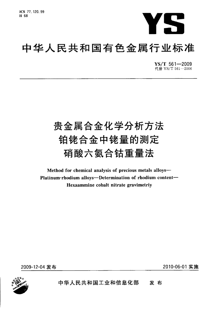 YS/T 561-2009 贵金属合金化学分析方法铂铑合金中铑量的测定硝酸六氨合钴重量法