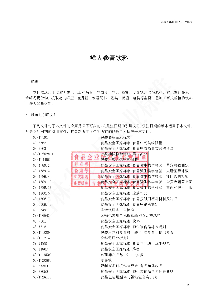 Q/KMXKH 0009S-2022 鲜人参膏饮料