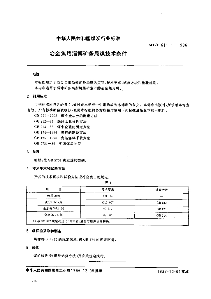 MT/T 611.1-1996 冶金焦用淄博矿务局煤技术条件
