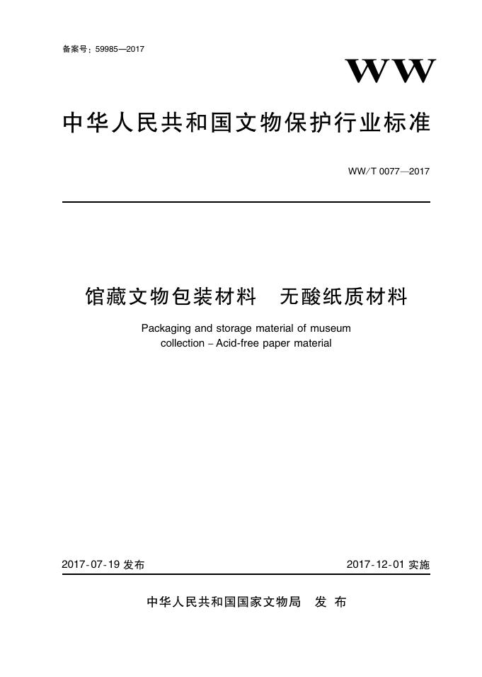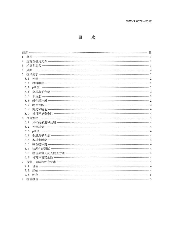 WW/T 0077-2017 馆藏文物包装材料 无酸纸质材料