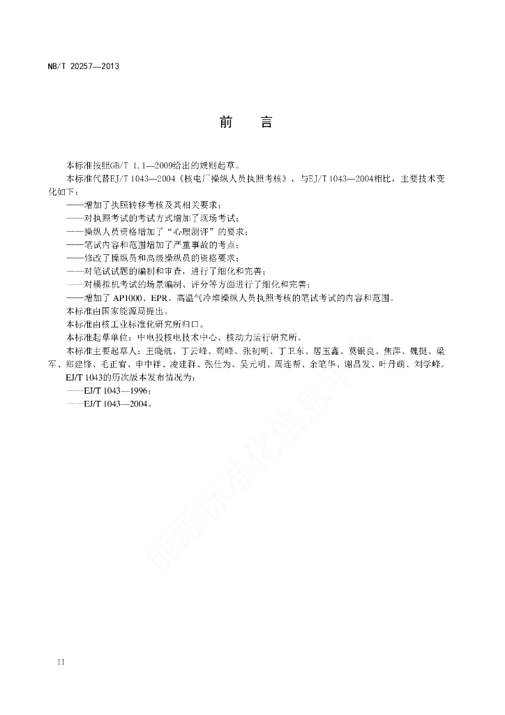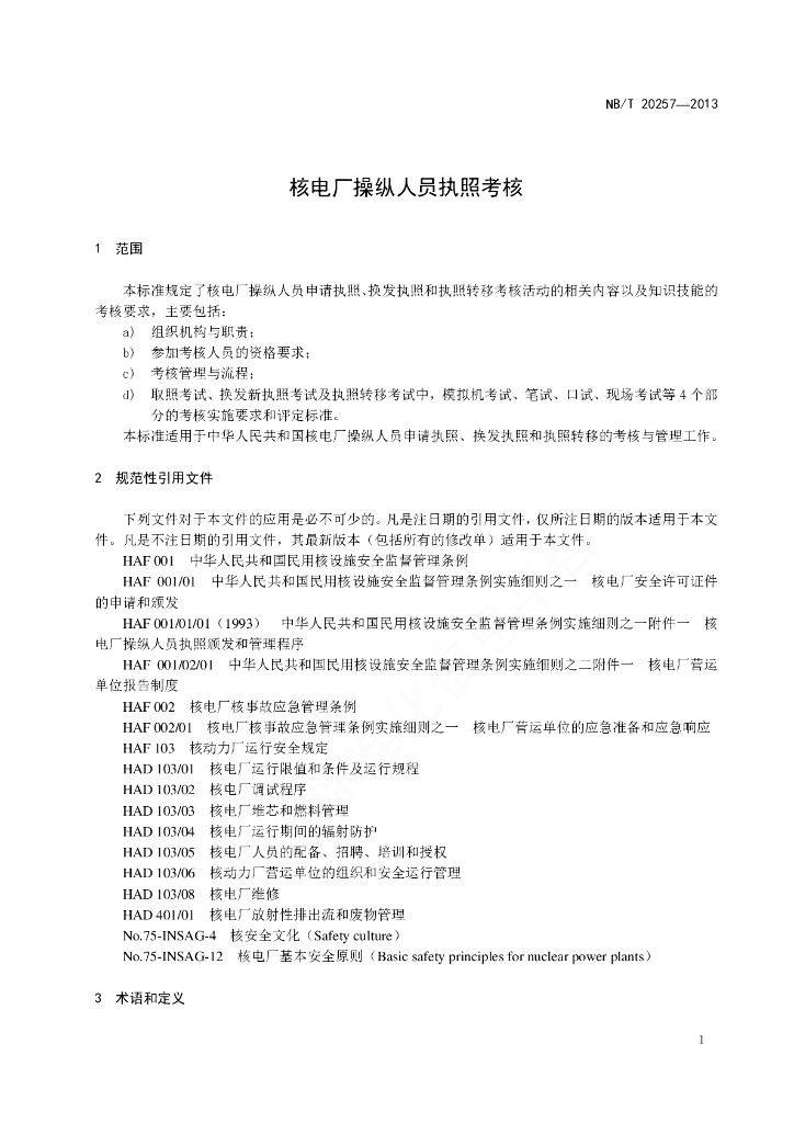NB/T 20257-2013 核电厂操纵人员执照考核