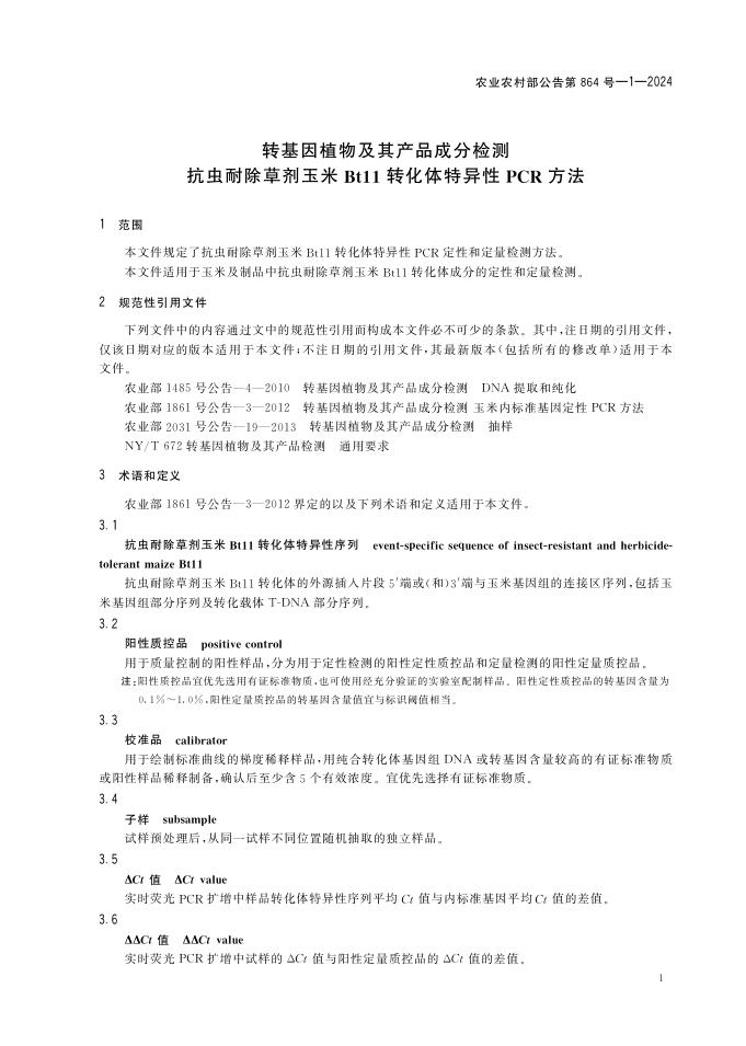 农业农村部公告 第864号-1-2024 转基因植物及其产品成分检测 抗虫耐除草剂玉米Bt11转化体特异性PCR方法