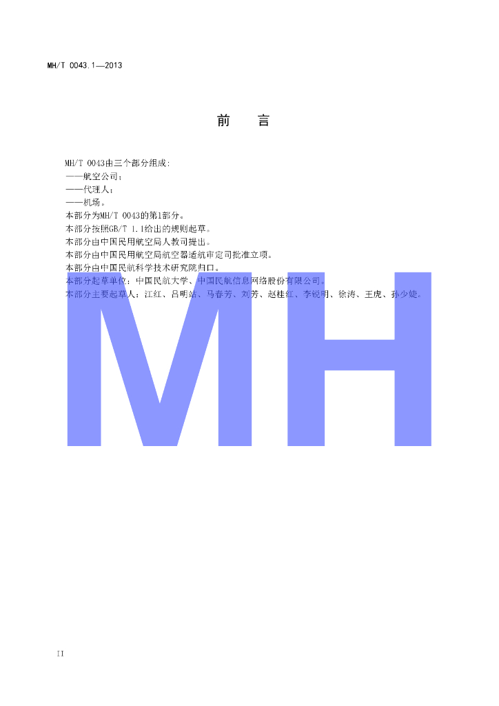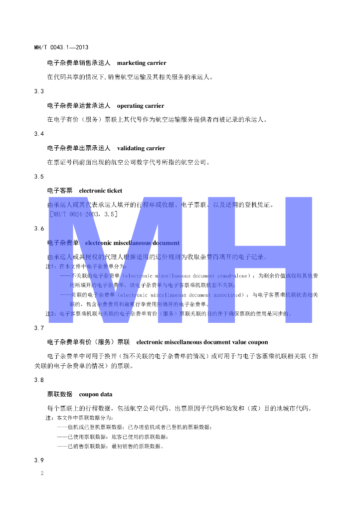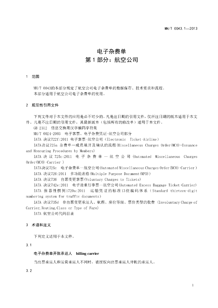 MH/T 0043.1-2013 电子杂费单 第1部分 航空公司