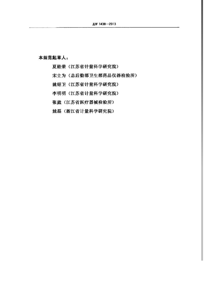 夏勋荣(江苏省计量科学研究院)、宋立为(总后勤部卫生部药品仪器检验所)、姚绍卫(江苏省计量科学研究院)、李明明(江苏省计量科学研究院)、张威(江苏省医疗器械检验所)、姚磊(浙江省计量科学研究院)