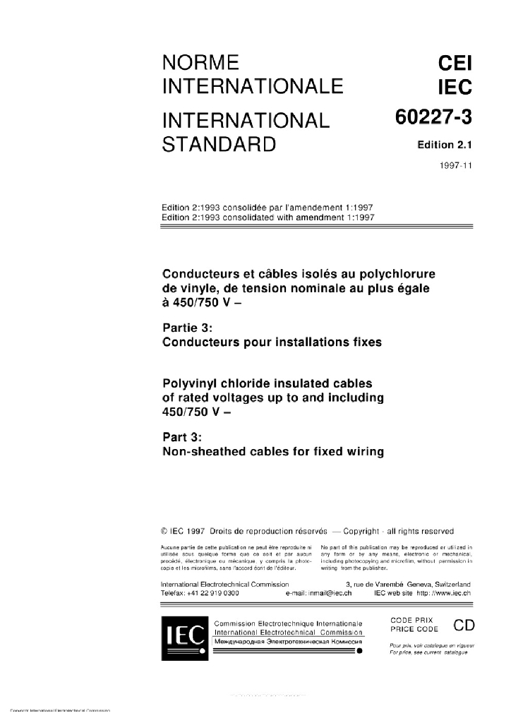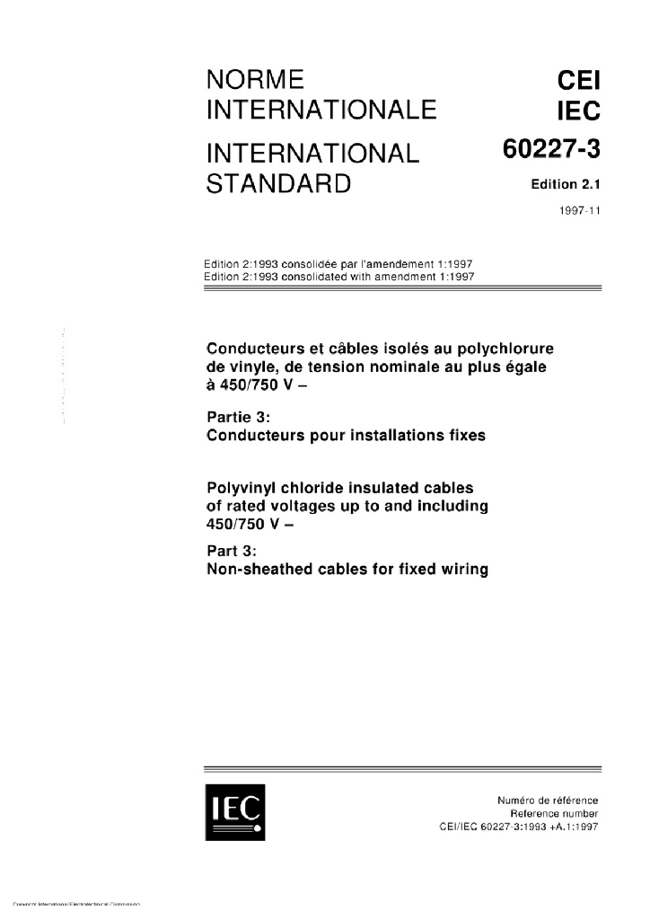 IEC 60227-3:1993+AMD1:1997 额定电压450/750V及以下聚氯乙烯绝缘电缆 第3部分 固定布线用无护套电缆