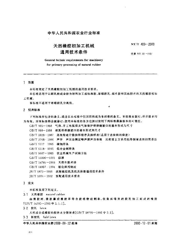 NY/T 409-2000 天然橡胶初加工机械通用技术条件