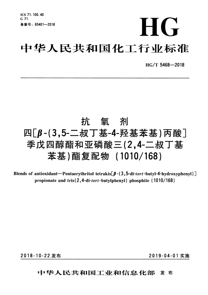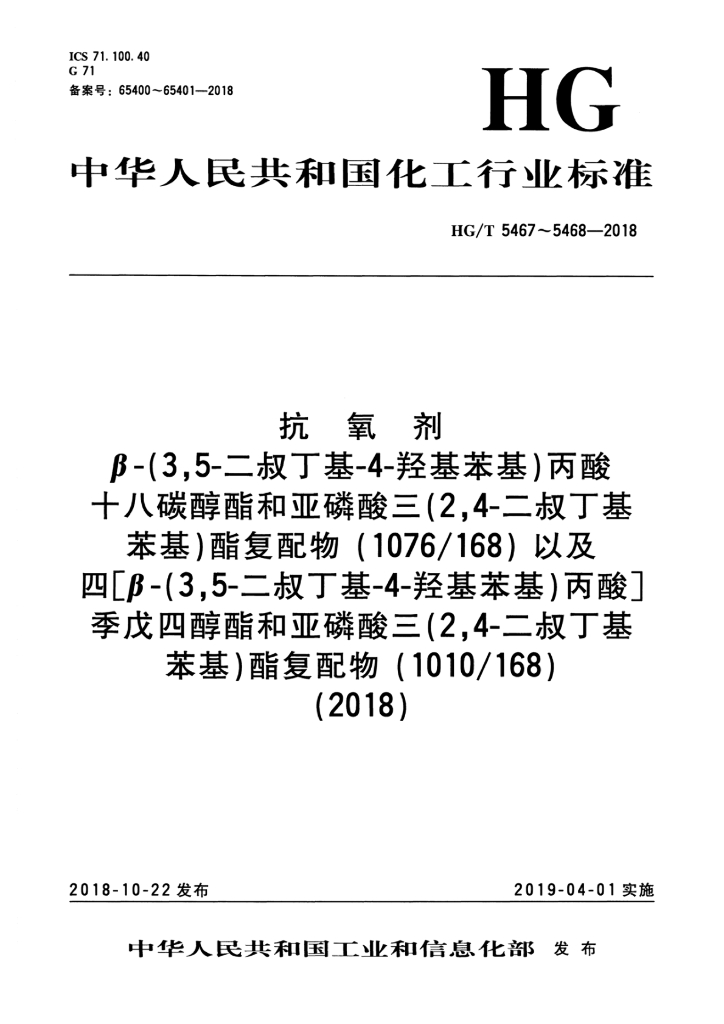 HG/T 5468-2018 抗氧剂四[β-(3,5-二叔丁基4-羟基苯基)丙酸]季戊四醇酯和亚磷酸三(2,4-二叔丁基苯基)酯复配物( 1010/168)