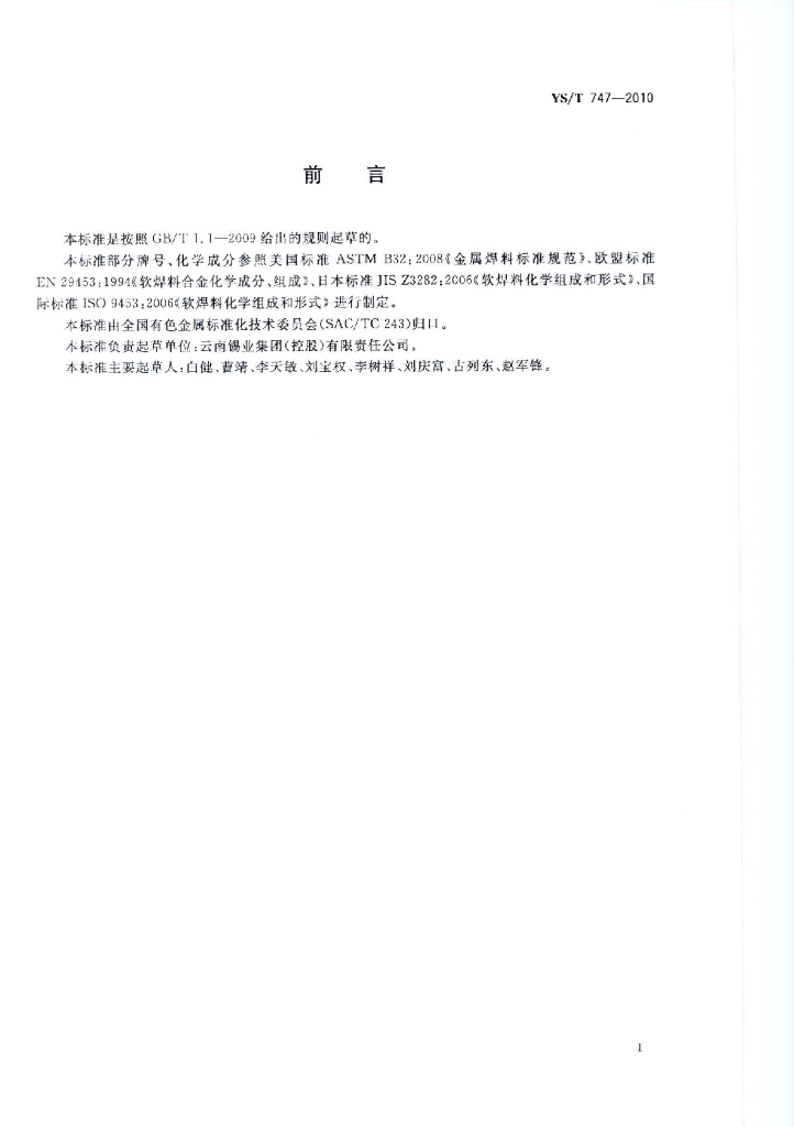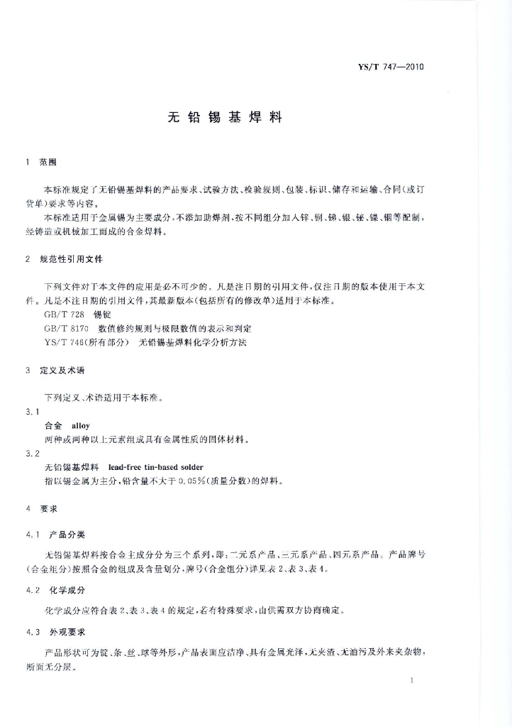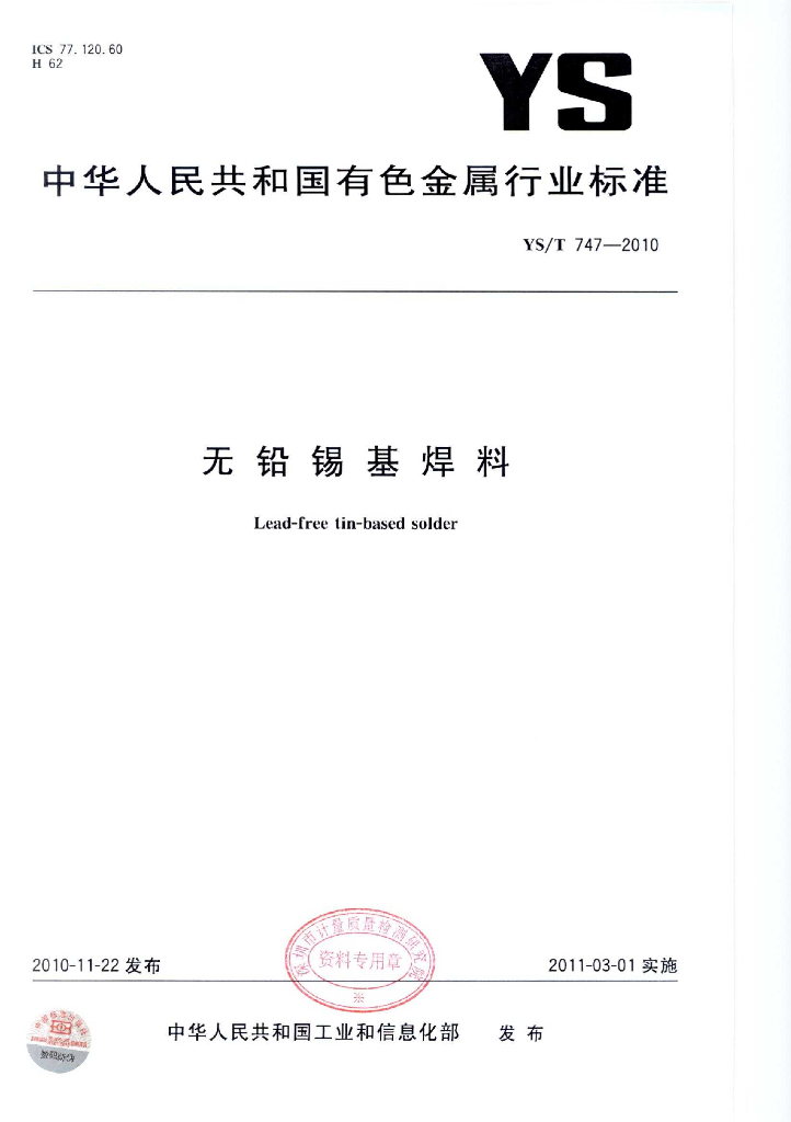 YS/T 747-2010 无铅锡基焊料