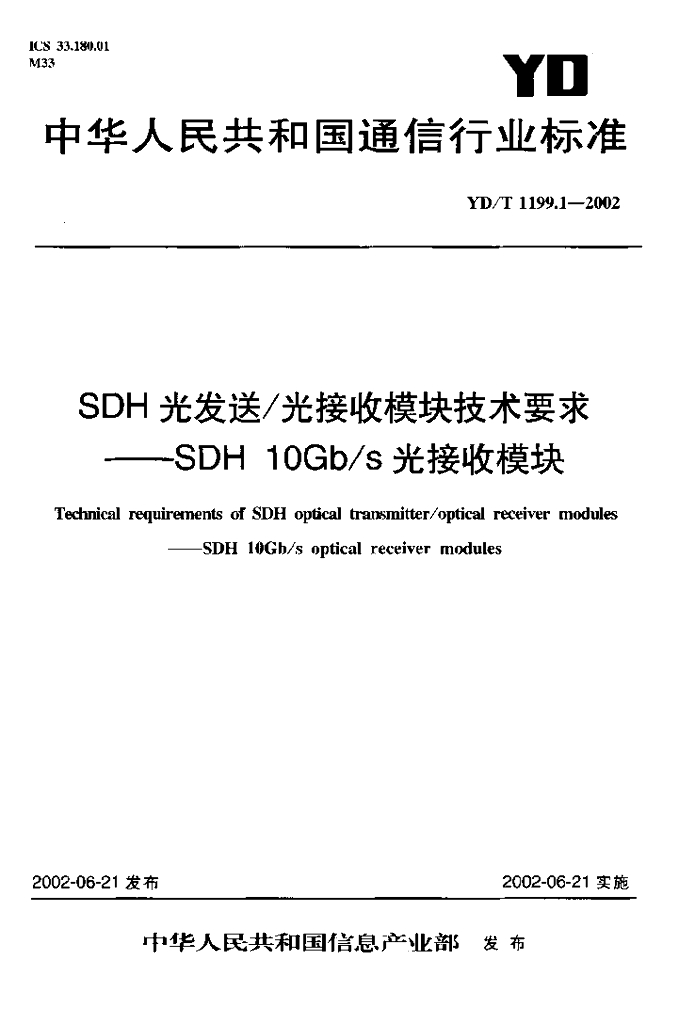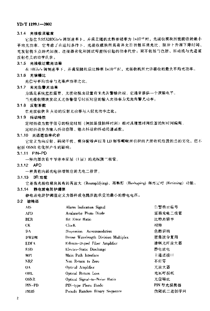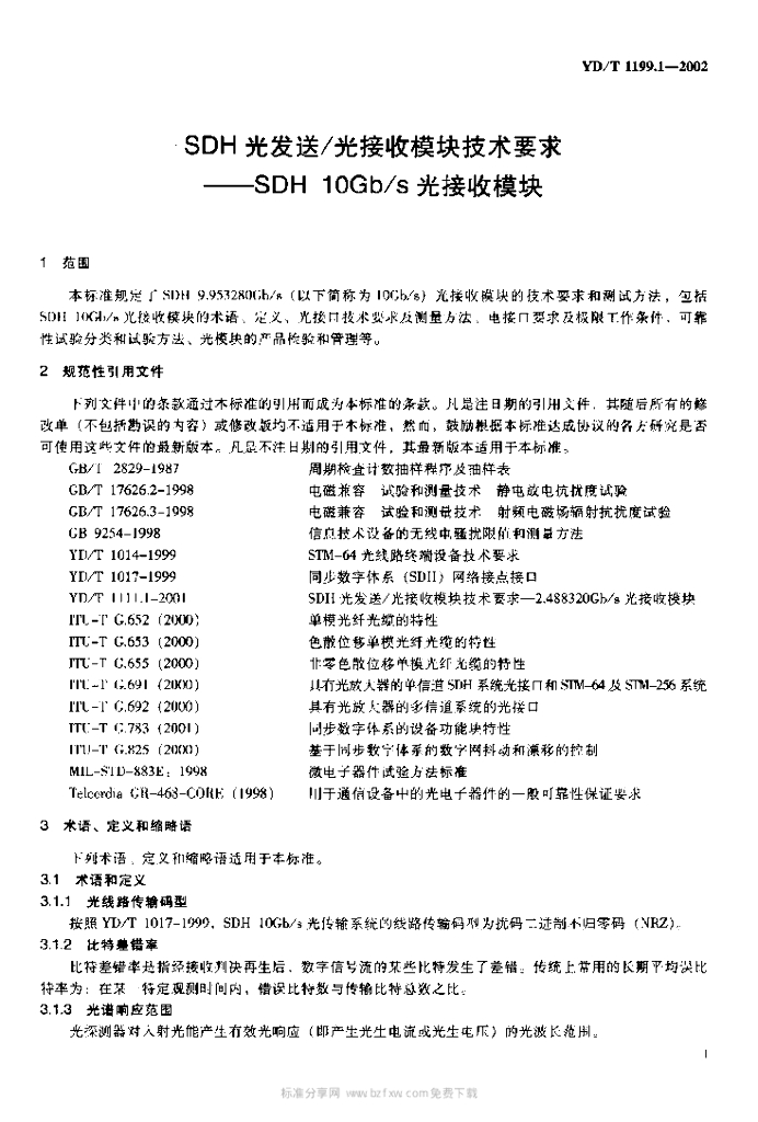 YD/T 1199.1-2002 SDH 光发送/光接收模块技术要求——SDH 10Gb/s 光接收模块